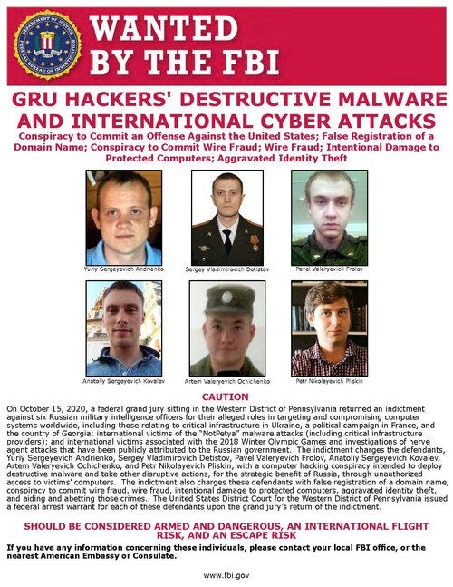 Attribution to the GRU is based on technical indicators of malware families and infrastructure, as well as its strategic and tactical alignment with Russian objectives. Further evidence is found in a 2020 federal indictment charging six named GRU Unit 74455 officers with conspiracy to conduct computer fraud and other offenses related to Several high-profile attacks.